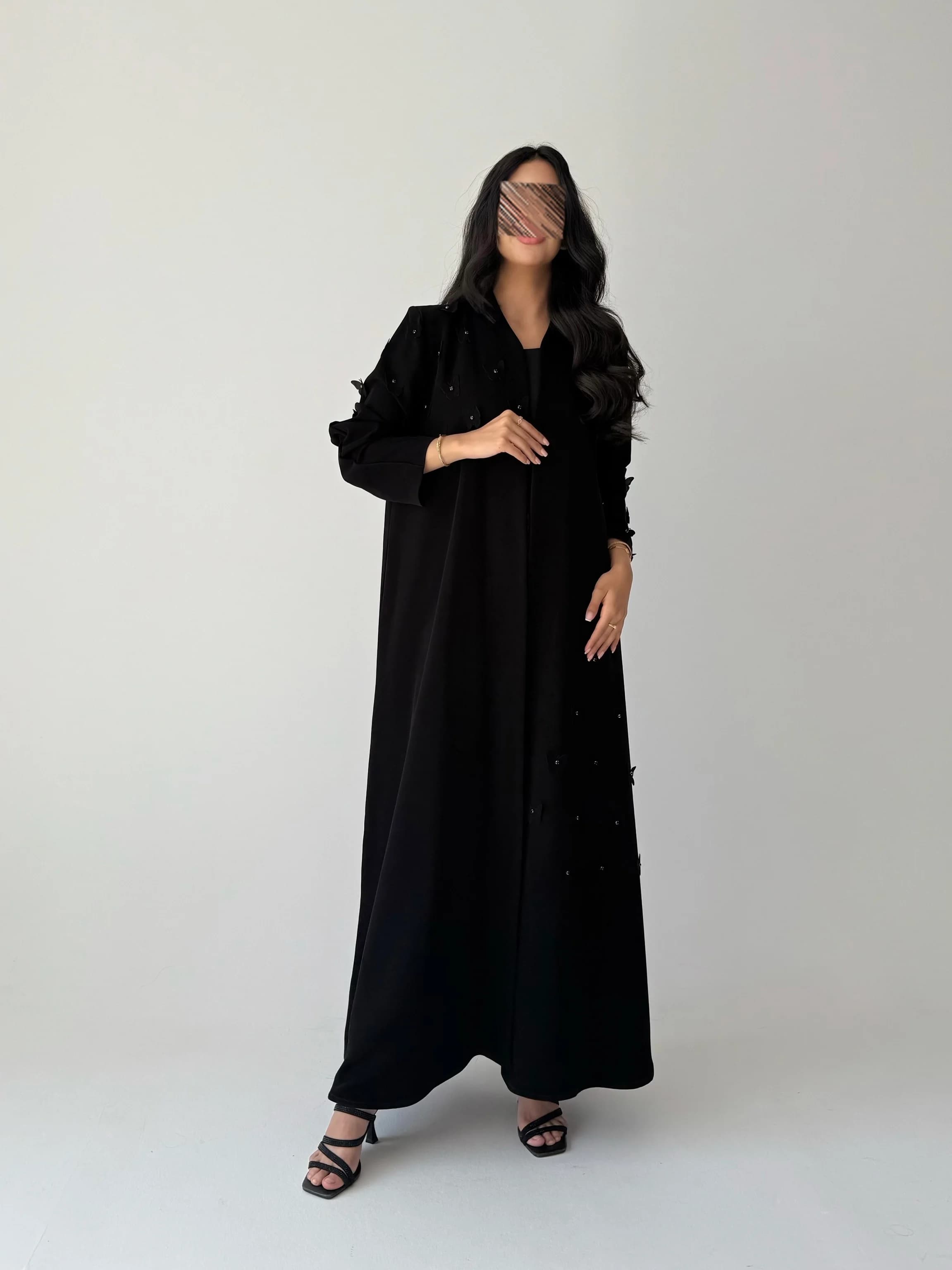 عباية مصممة بعناية من قماش السرّاميك الفاخر، مزينة بتفاصيل فراشات بارزة مع تخريم فني دقيق ولمسات من اللؤلؤ تضيف لمسة فاخرة بلا مبالغة.