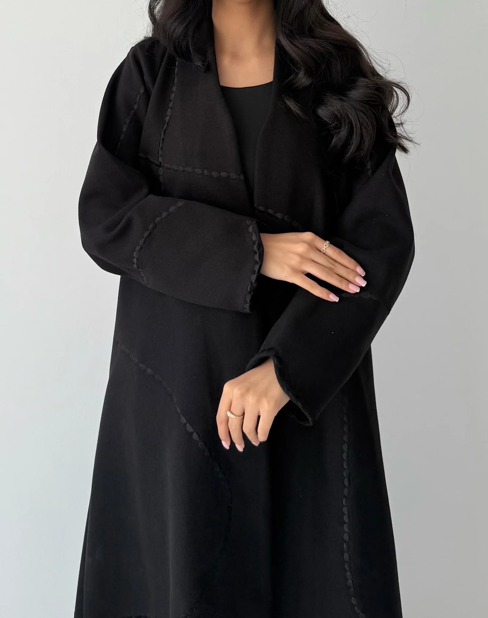 هذه العباية مصنوعة من قماش الجوخ الثقيل الناعم، مزينة بتطريز أسود أنيق يضفي لمسة كلاسيكية راقية.