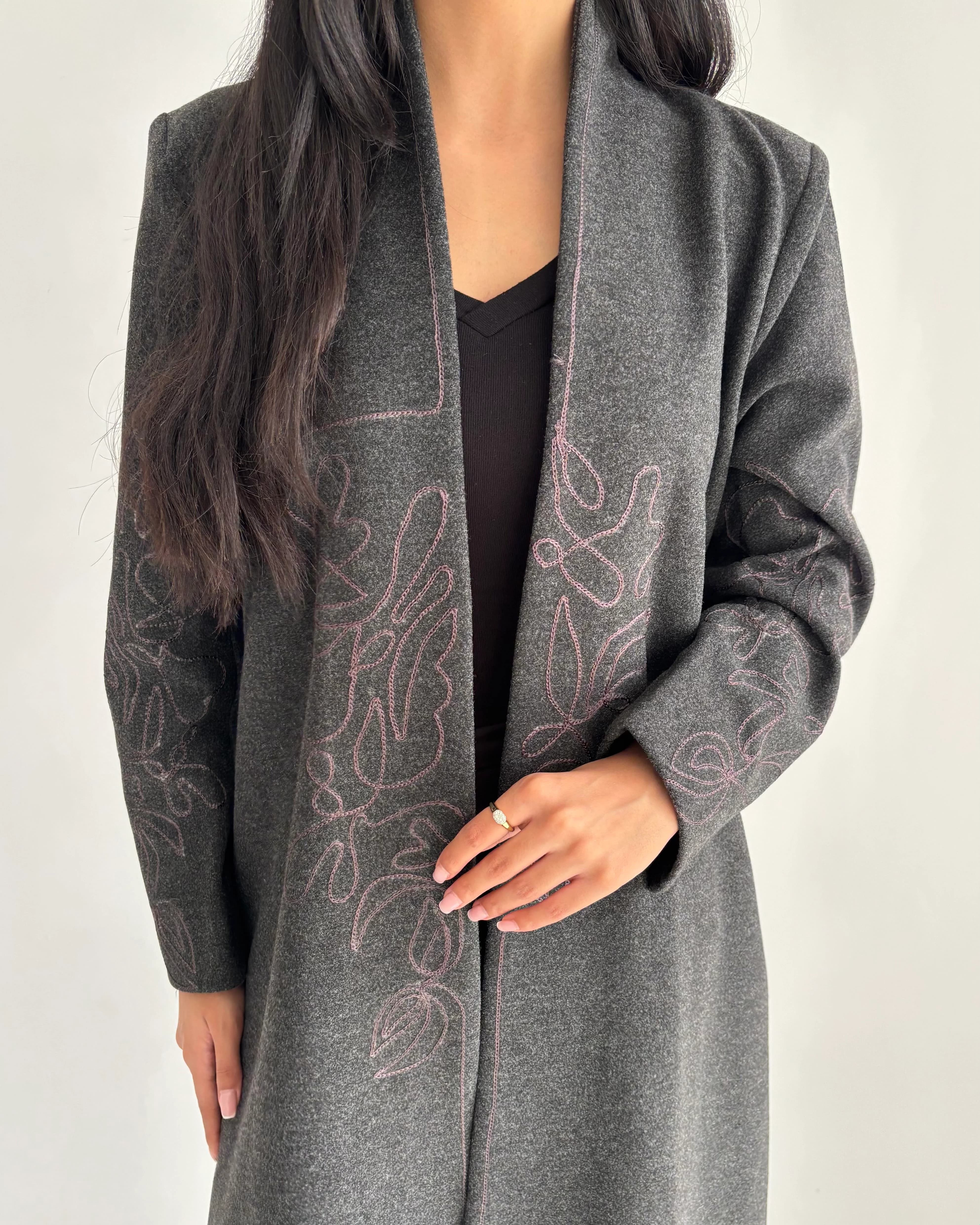 عباية شتوية جوخ بتطريز وردي – لون رمادي | R50