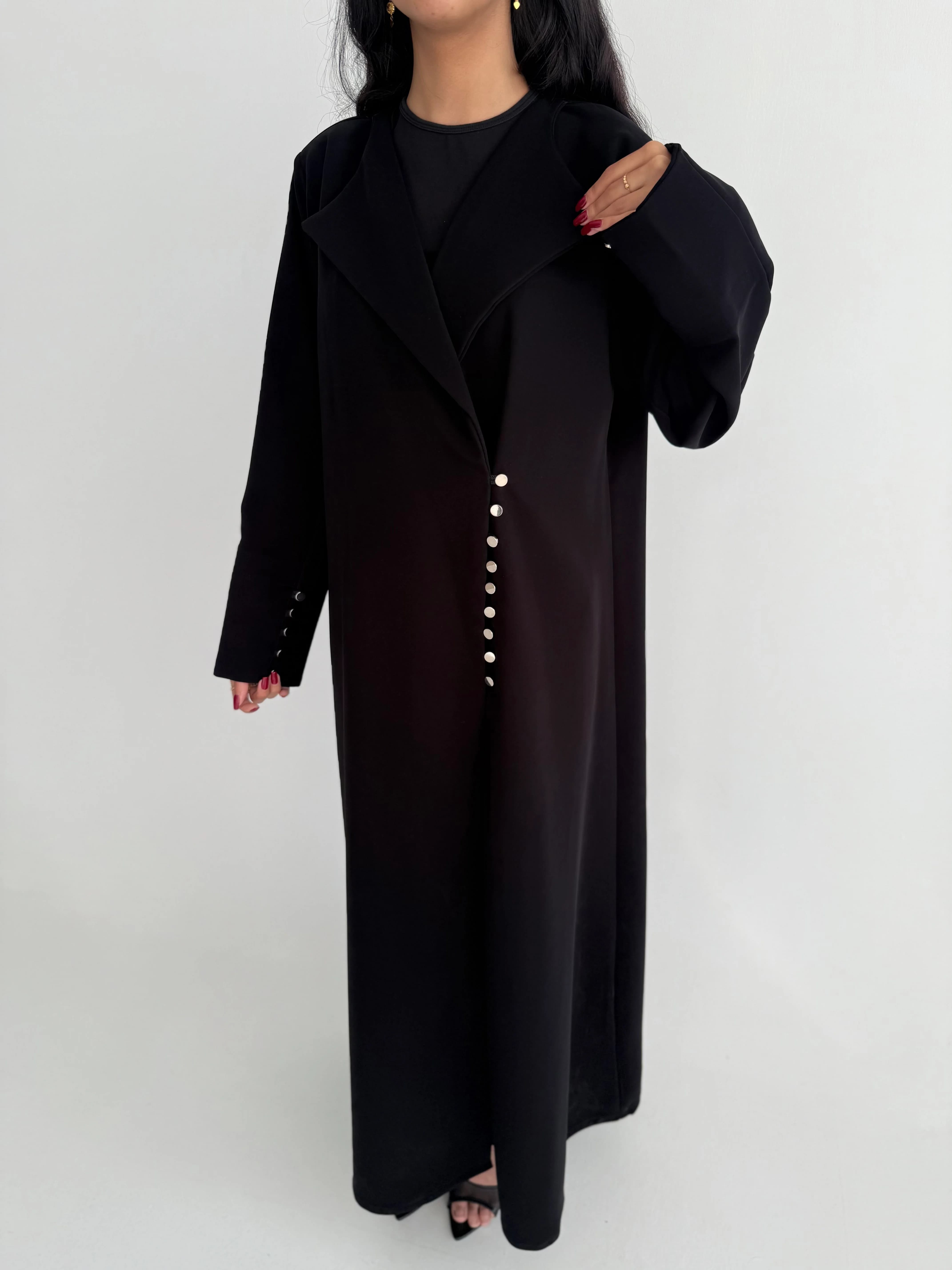 وصف المنتجعباية صيفية بتصميم أنيق مصنوعة من قماش الكريب الإندونيسي المعروف بخفته ونعومته، تأتي بلمسات تصميمية عصرية تتمثل في أزرار أمامية على الكم تمنح مظهرًا راقيًا وفريدًا. تعتمد العباية قصّة نص كلوش التي تمنح انسيابية مريحة وتناسب حرارة الصيف، مع اللون الأسود الكلاسيكي الذي يناسب كل الأوقات والمناسبات.